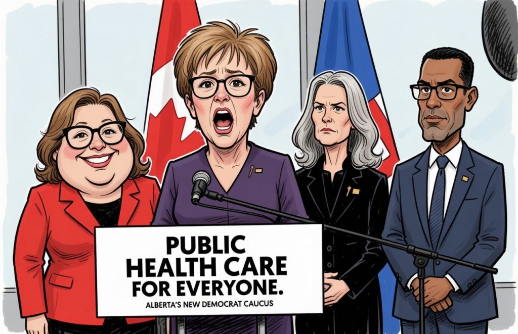 EDMONTON – Sarah Hoffman and the Orange Dream Team (Lori, Luanne, Sharif — looking like they raided the same construction-site wardrobe sale) took the stage with full apocalypse mode: “Albertans are dying in ERs! Million without family docs! Seniors alarming! Mental health? Poof! Lives depend on it!” Emergency debate! State of emergency! Central command! Petition at albertahealthcrisis.ca — sign now or your grandma’s wait time becomes permanent!